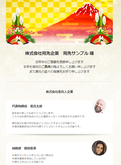 髙谷そうです。会社としての挨拶と、宛先の方と関わりのある社員からのメッセージをひとつの画面にまとめることができます。その画面のURLを宛先の方にメールで送り、クリックしてもらうとことで、相手の方にカードを見てもらえます。