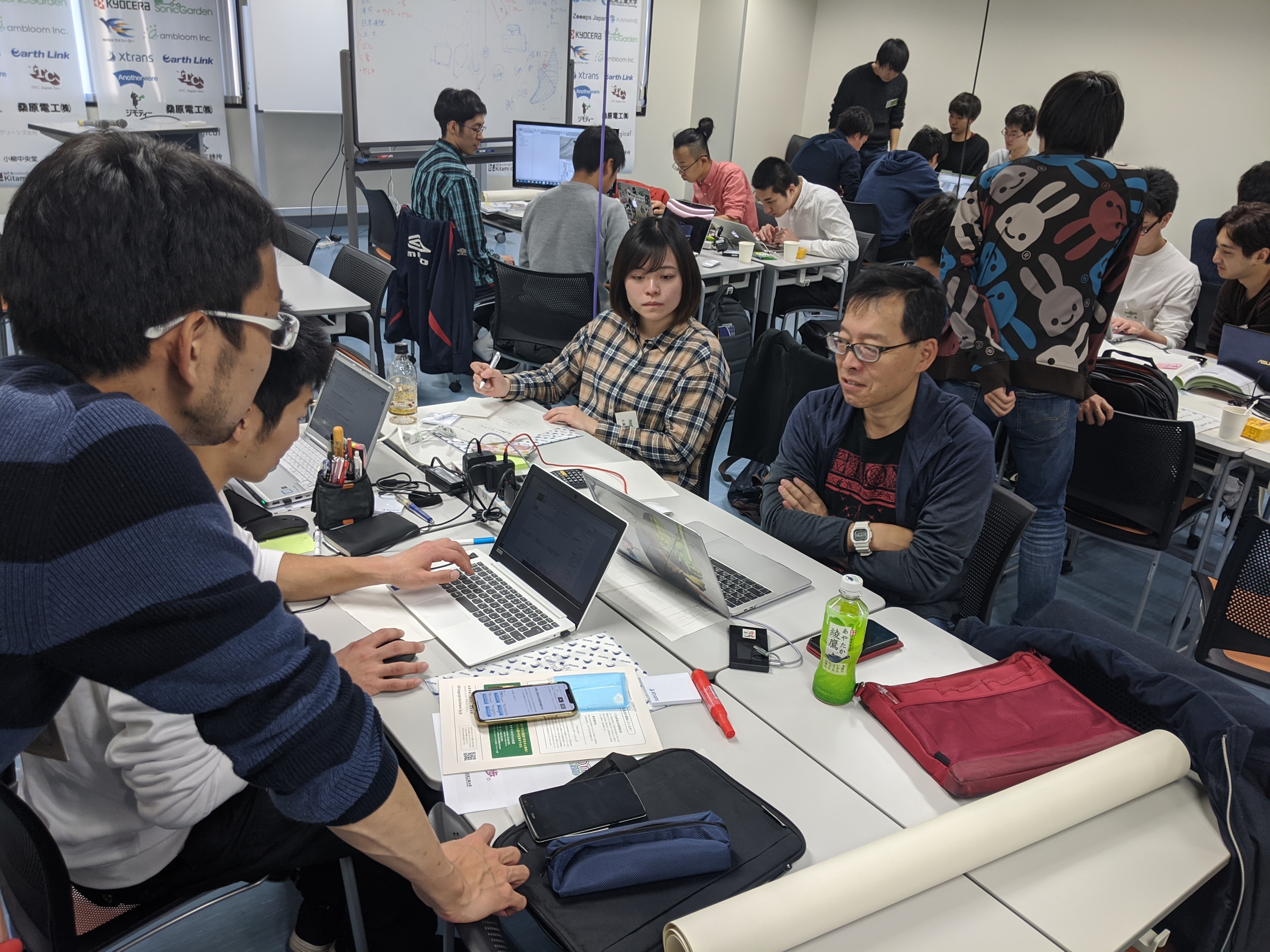 アイディアソンから初めて、二日目の成果発表を目指してガシガシ開発。複数人開発をするのは初めてな学生さんが多いのでGitについて教えたり、色々ゼロベースからのハッカソン。 果たしてものは出来上がるのか!?