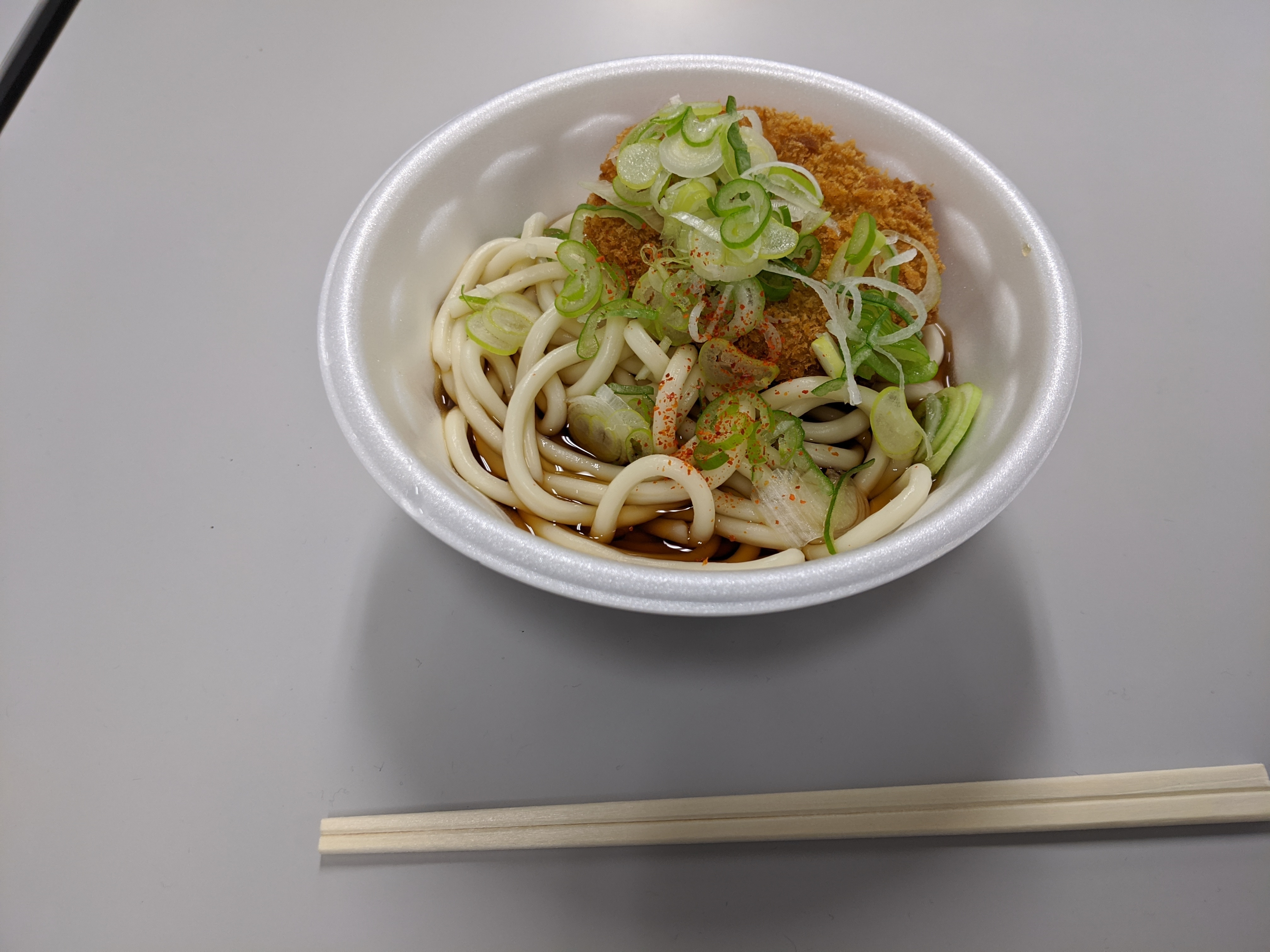 お昼は「たまころ」(玉ねぎコロッケ)とうどん。北見は玉ねぎが有名らしい。 玉ねぎの甘みが揚げることでより際立って、とても美味しい。