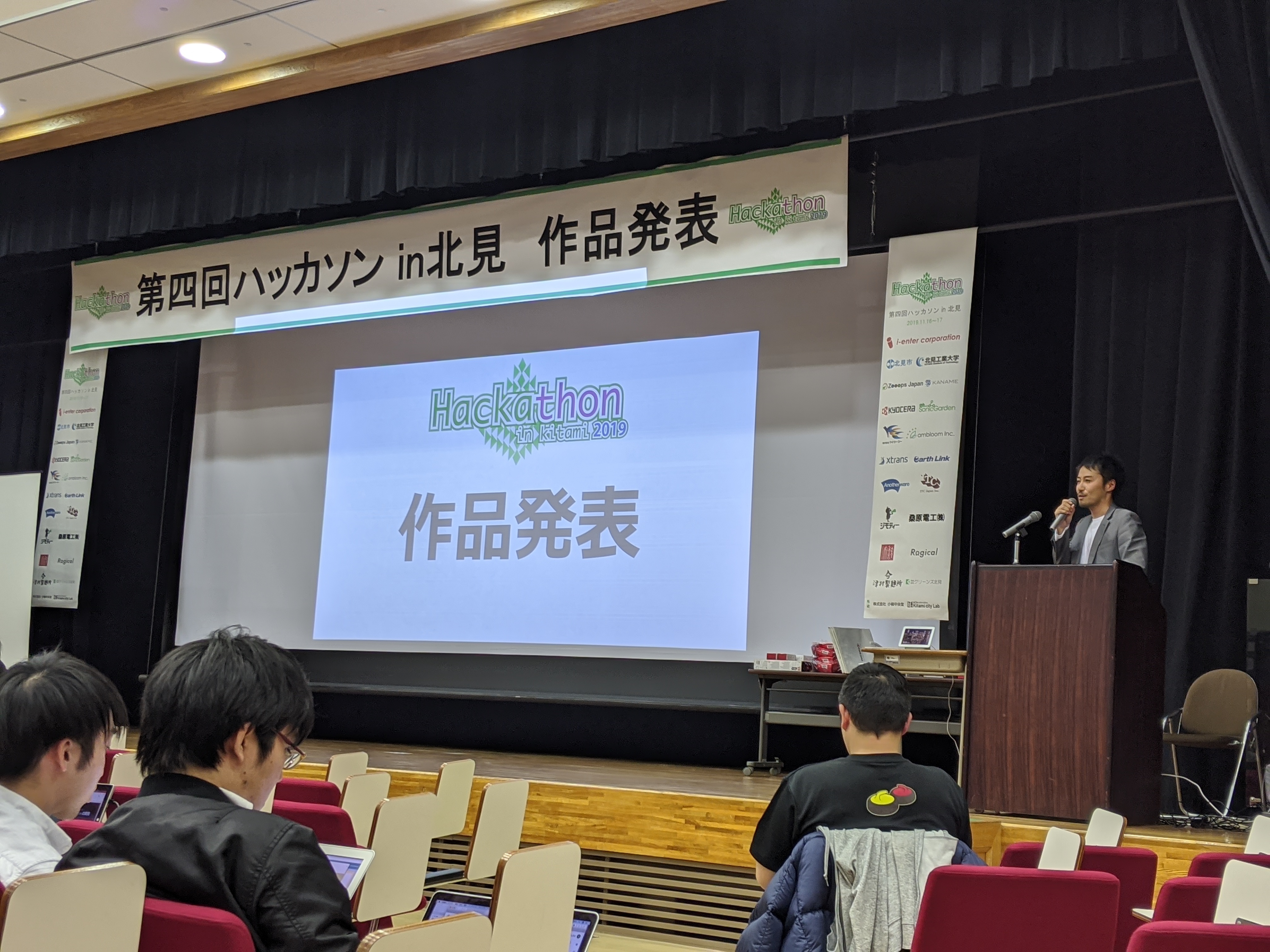 北見工大の講堂にて全チーム(14チーム)で発表を行いました。 持ち時間は一チーム3min。東京へ帰る組の飛行機の時間もあるので3minを過ぎると問答無用で司会から止められるシステム。