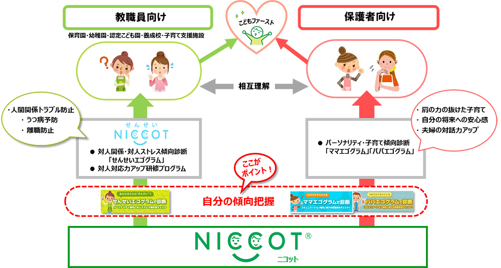 せんせいNICCOTへの理解や導入を希望する園が、増え始めました。 導入した園からは「客観的に自分のことが分かり、まわりの人との関係に気を配るようになった」というフィードバックもあり、次年度も継続したいという要望が届いているそうです。近い将来、先生たちの離職率の改善や就職率の向上と数値化できるような効果測定を考えています。また、ママエゴグラム・パパエゴグラムも保護者向けのNICCOTとして、せんせいNICCOT導入園を通して提供しています。