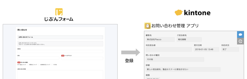 じぶんフォームはkintoneと連動したWEBフォームが簡単に作成できるサービスです。じぶんフォームを利用すればフォームに登録したデータが自動的にkintoneへ保存されます。