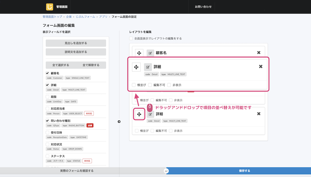 また、見出しや説明文の追加、項目を横並びに配置する、フィールドを「編集不可」(表示のみで編集はさせない)にするなどフォームを見やすく整えることも設定上で簡単に行えます。