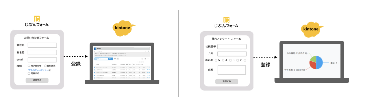 自社サイトの問い合わせや、商品の注文受付で利用すれば後続の業務の進捗がkintone上で管理出来ますし、社内での研修アンケートに利用すればkintoneの機能を活用して集計表も簡単に作成可能です。