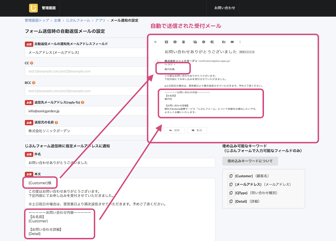 本文やタイトルにはフォームで登録した値を利用することも可能です。また、Cc/Bccにも対応しております。