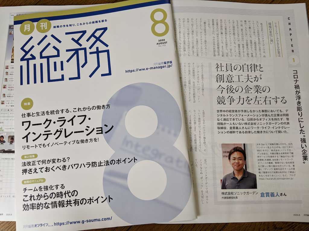 「月刊総務(8月号)」にて弊社代表の倉貫の取材記事が巻頭の特集に掲載されました 2020年07月08日 「月刊総務(8月号)」にて弊社代表の倉貫の取材記事が掲載されました。 「ナレッジワークの産業がこのまま育っていけば、 『企業の目標に賛同する社員同士が、フラットな関係で、セルフマネジメントにより成果を出していく』、そういう体制に変わっていくと思います」 月刊総務 巻頭の特集記事で、リモートワークに必須のセルフマネジメントについてお話しています。ぜひご覧ください。