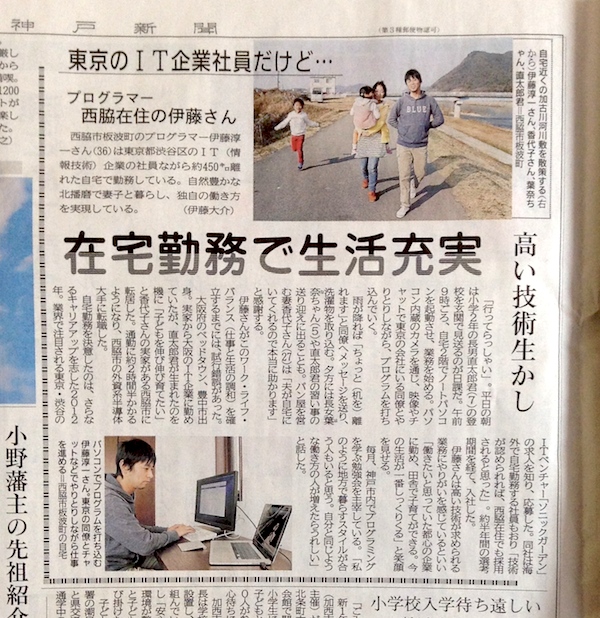 神戸新聞北播版の朝刊に、兵庫県西脇市から在宅勤務する弊社社員の取材記事が掲載されました