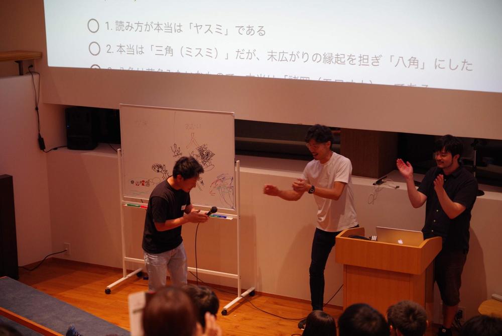 大人たちは先のアプリクイズの正解数を競って、豪華景品を狙います。 まずは、面白クイズや珍回答を司会者である副社長の藤原がいじります(笑)