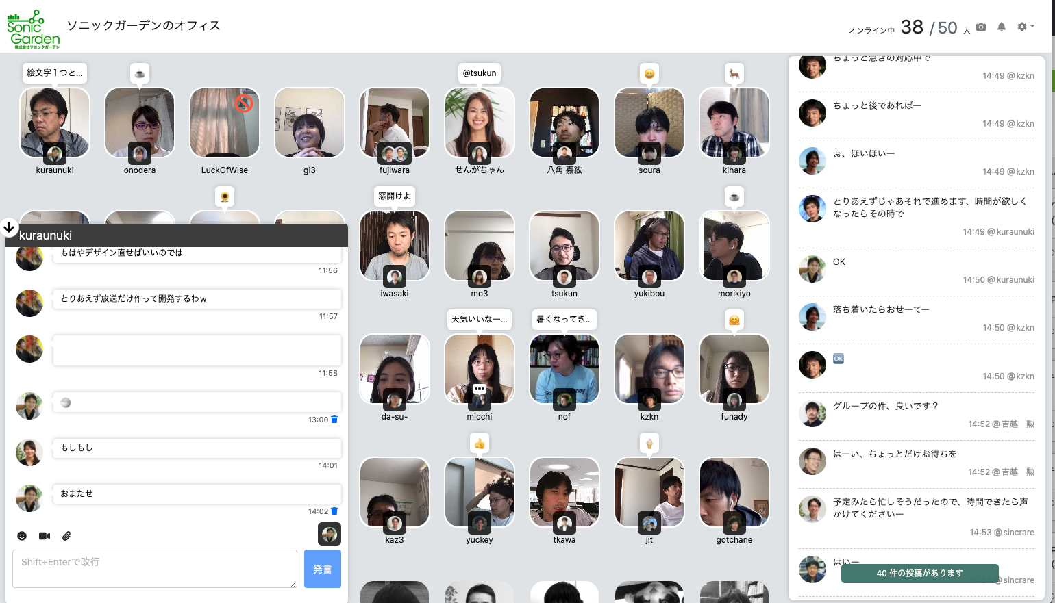 ソニックガーデンで自社開発した仮想オフィス「Remotty」。メンバーの働いている様子が一覧で表示されます。