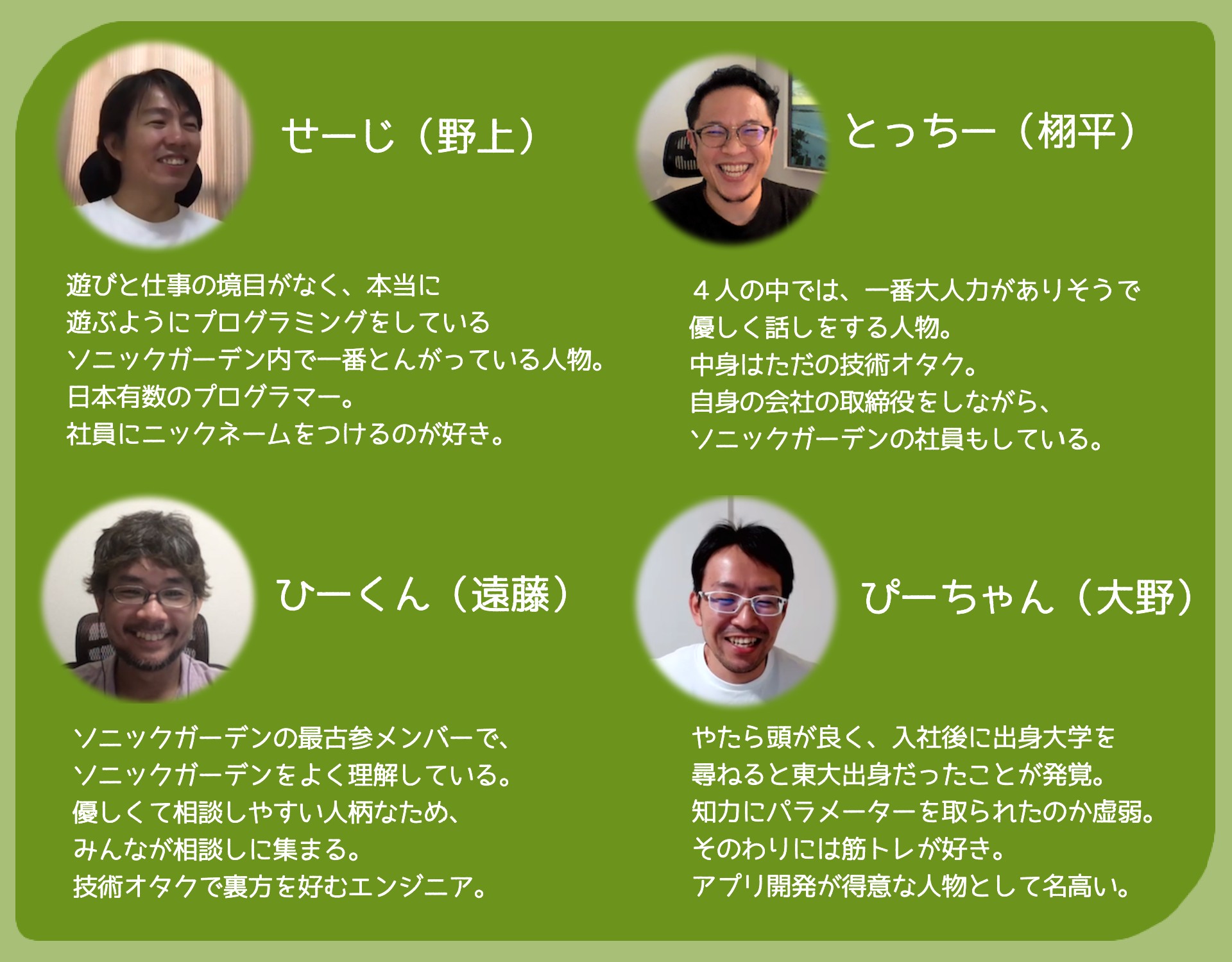 今回はソニックガーデンのプログラマ4人に、この「遊ぶように働く」を実際どのように体現して、仕事を楽しんでいるのかを座談会で話してもらいました!