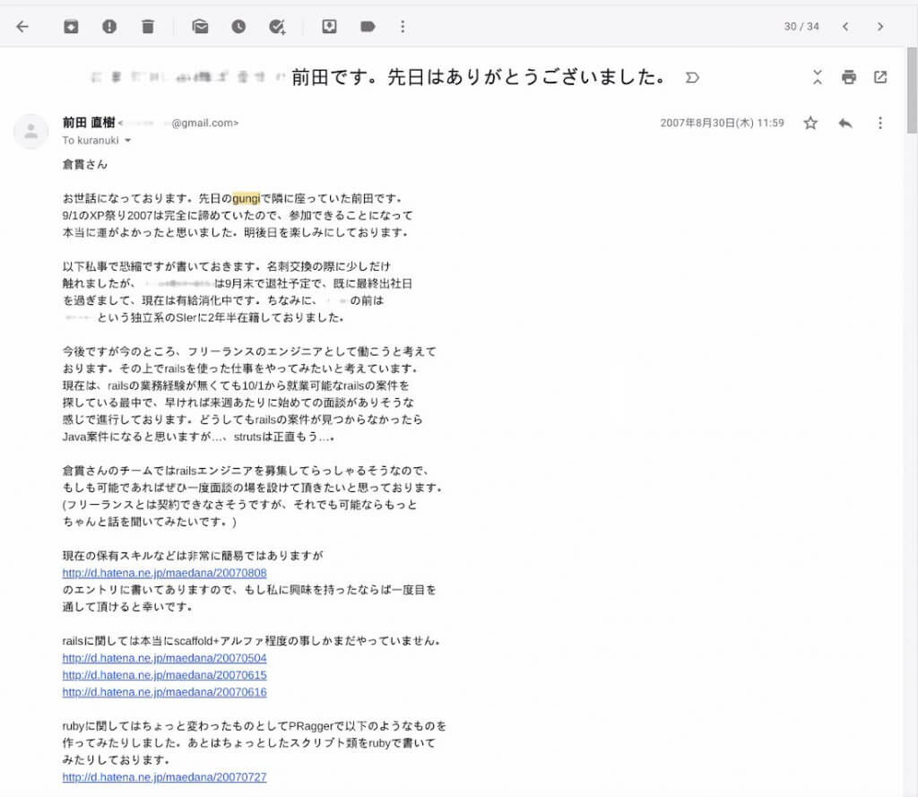SKIPの開発が軌道に乗り始めた2007年8月30日、一本のメールが倉貫のもとに届きます。送信元は、前田直樹(Programmer / 顧問CTO)。フリーランスのプログラマとして独立するにあたり、仕事先を探していた前田が、倉貫のチームで働きたいという要望を書いたメールでした。