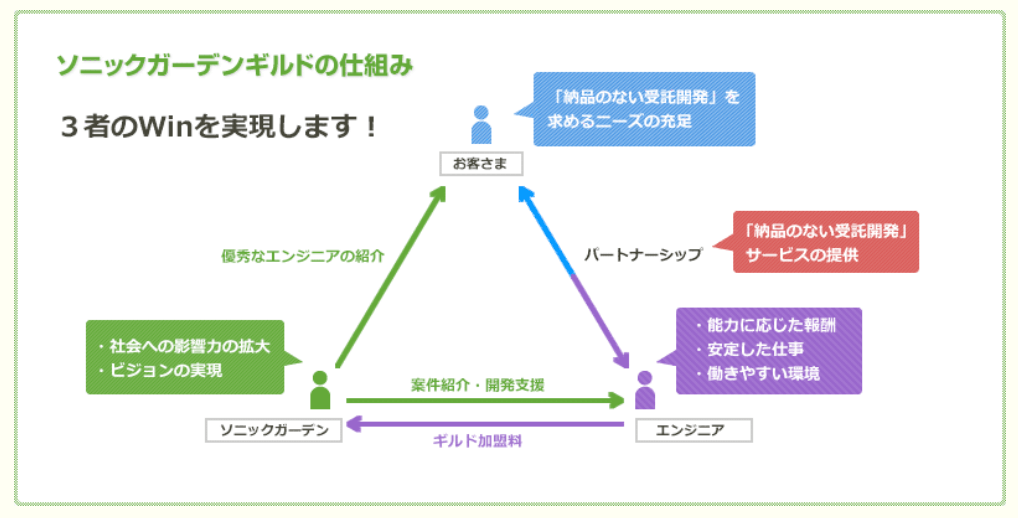 「問い合わせが増え、社内にいるプログラマだけでは対応できなくなっていました。せっかく相談しにきてくれたのにお断りするのも心苦しい。解決する手段として、ソニックガーデンのビジネスモデルを他のプログラマに提供して、お客様と繋げるという方法を考えたんです。プログラマには案件を紹介する代わりにギルド加盟料をもらう。これが、ソニックガーデンギルドです」(倉貫)