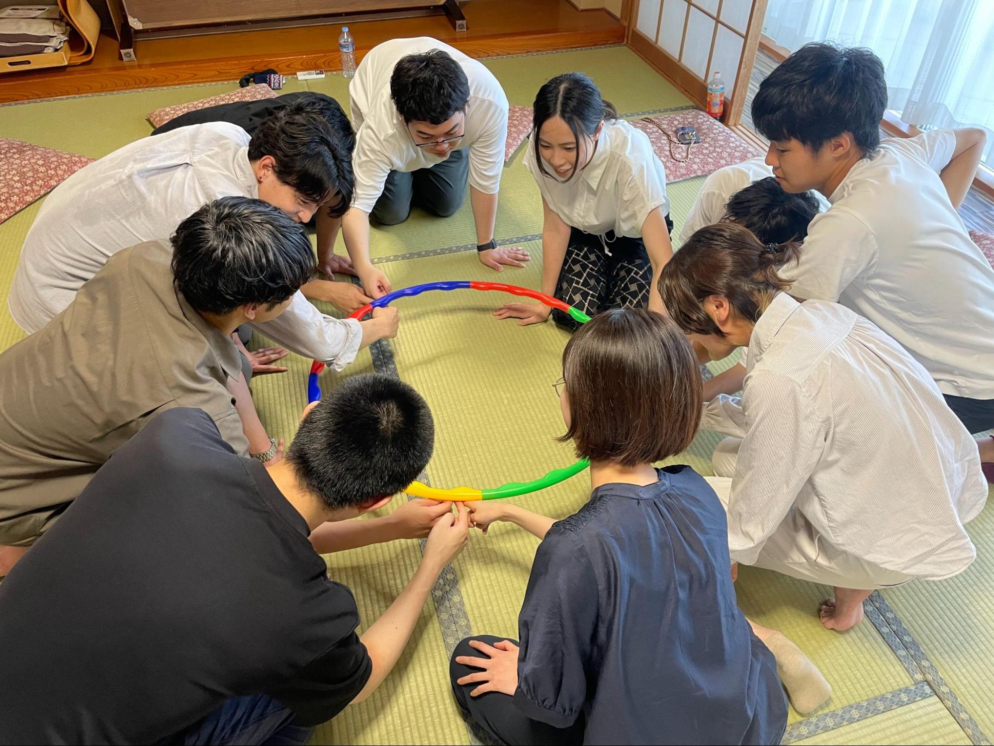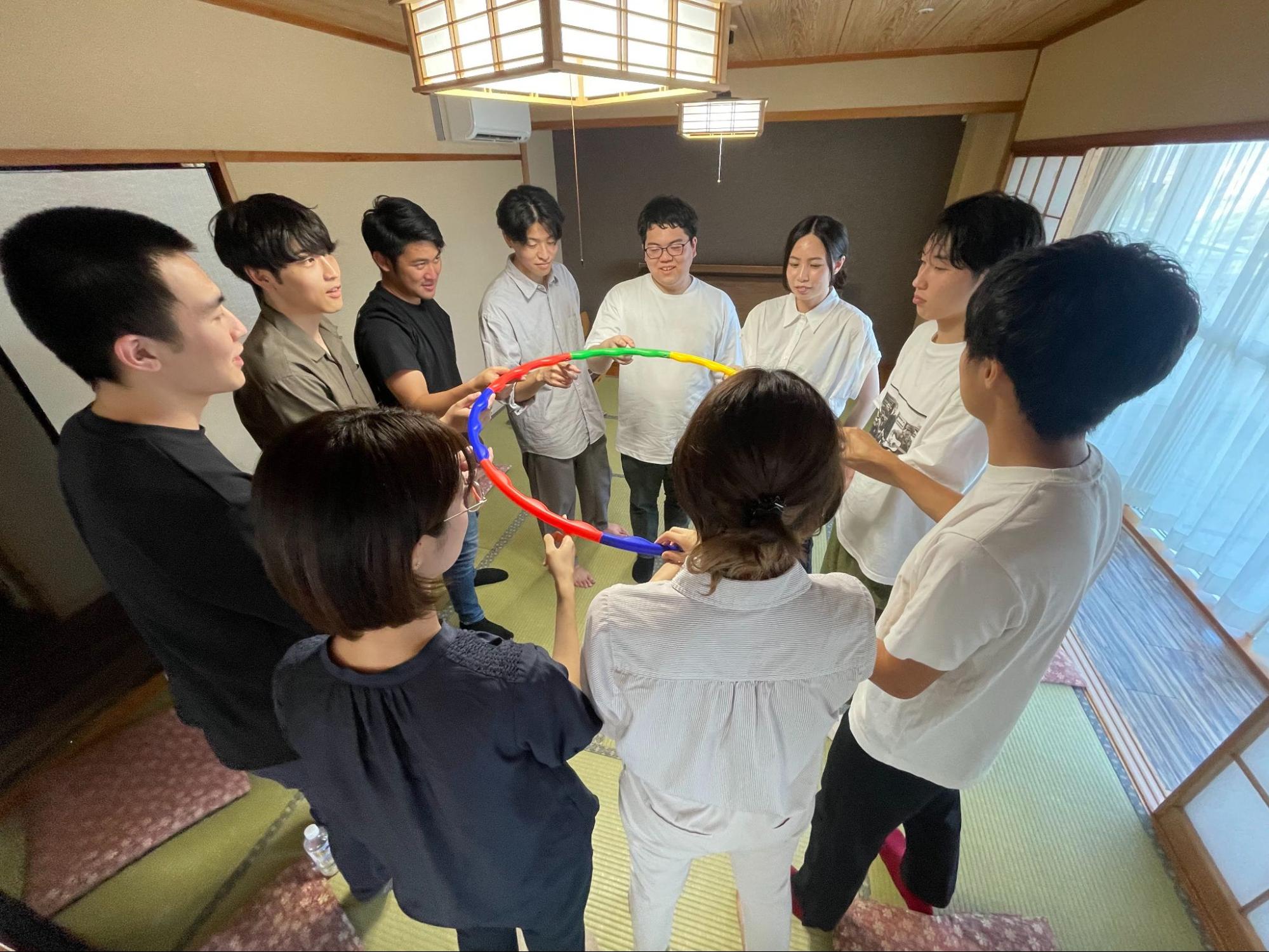 2日目のアクティビティとしては、「フープリレー」を行いました。 フープリレーは、手をつないで輪になり、全員がフラフープをできるだけ短時間でくぐることを目指すもの。