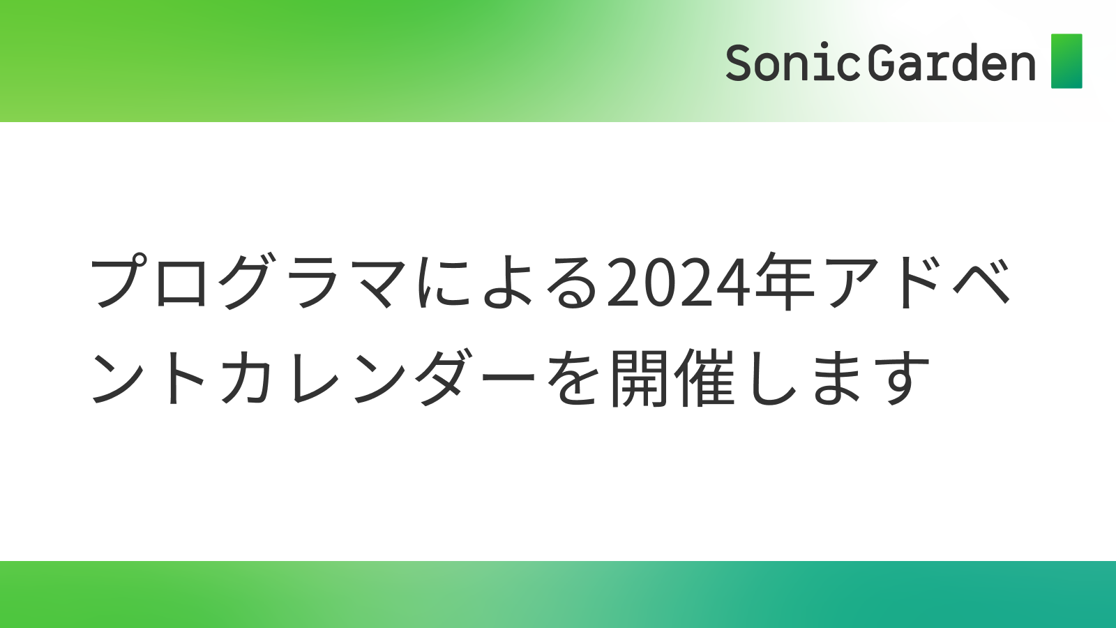 プログラマによる2024年アドベントカレンダーを開催します 2024年11月29日 2015年以来9年ぶりに、ソニックガーデンのアドベントカレンダー企画を開催します! ソニックガーデンのプログラマ達が、12/1〜12/25まで毎日記事をアップします。 今年は「ベテラン」と「若手」の2つのカレンダーを同時開催。 合計で50個の記事をお届けします。 以下のリンクからお読みください。 ベテランカレンダー 若手カレンダー 12/25追記 無事に完走しました!