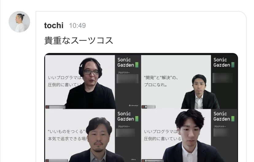 などなど、高卒採用のメンバー以外は、ソニックガーデンの提供する「トレーニングセンター」で絡みがありますので、すでに親密になっている仲がうかがえる内容でした。