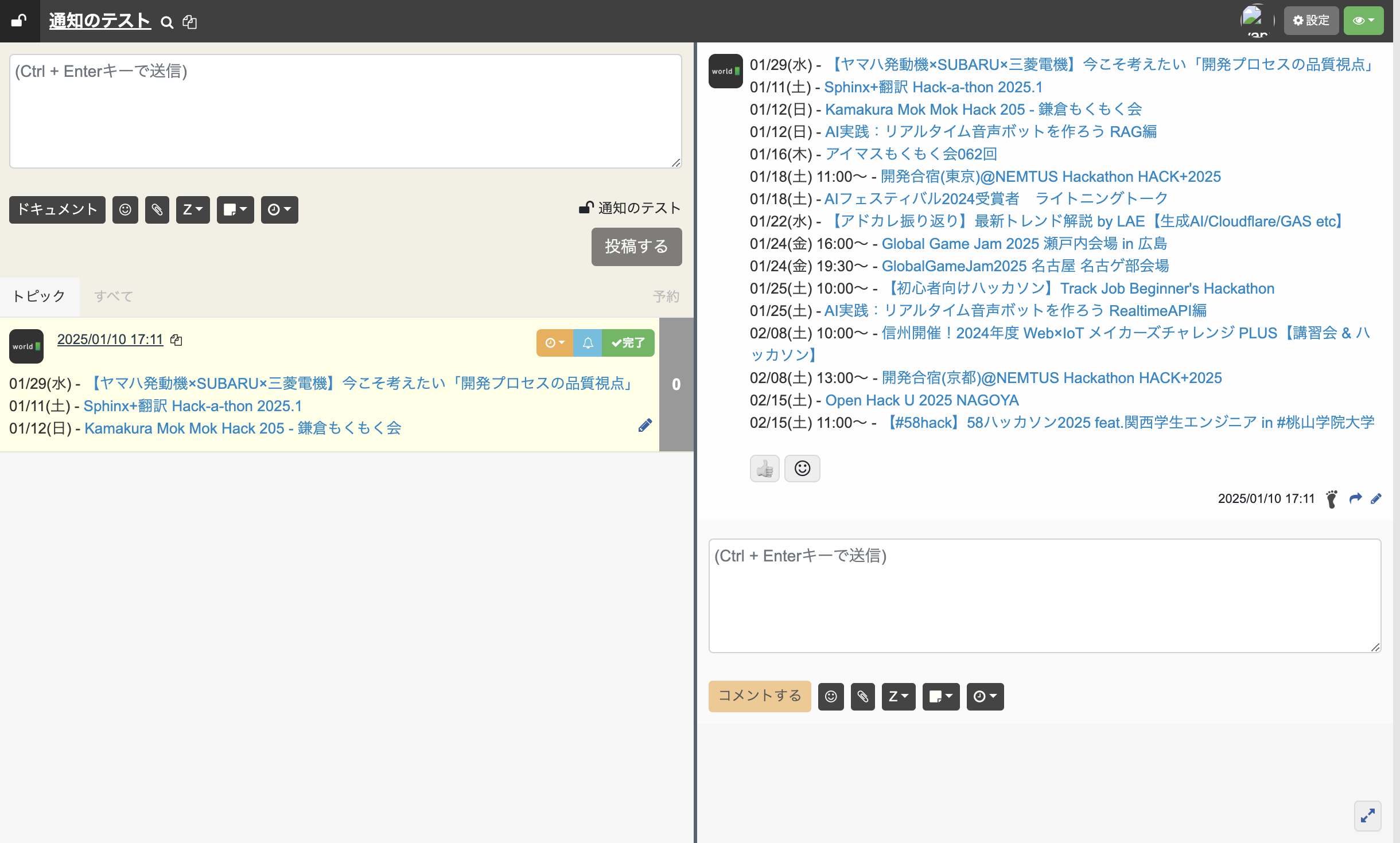 社外のハッカソン情報を、月に1回社内掲示板に通知する機能です。