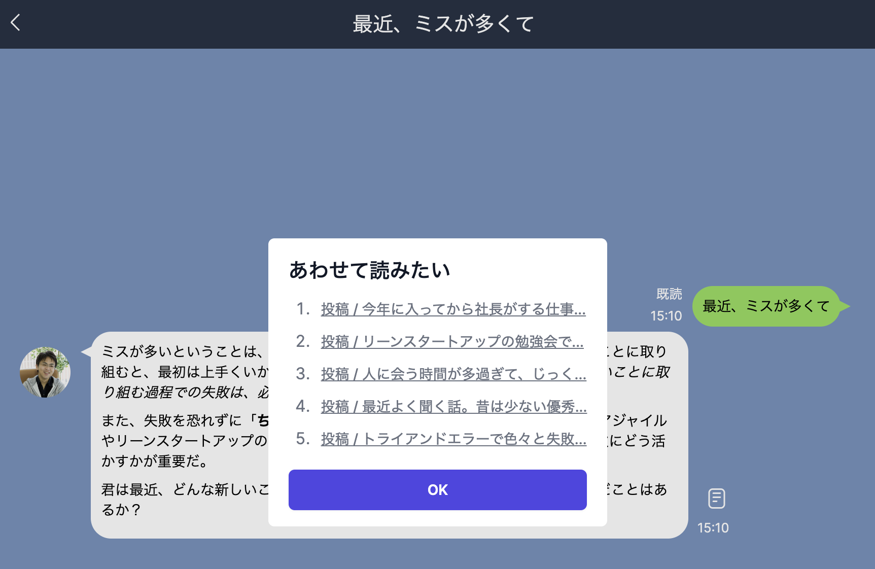 弊社代表、倉貫のブログ全2028記事170万文字を元データとして返信してくれるAIチャットボットアプリです。相談すると内省を促してくれ、返信の参考にされた記事も参照可能です。