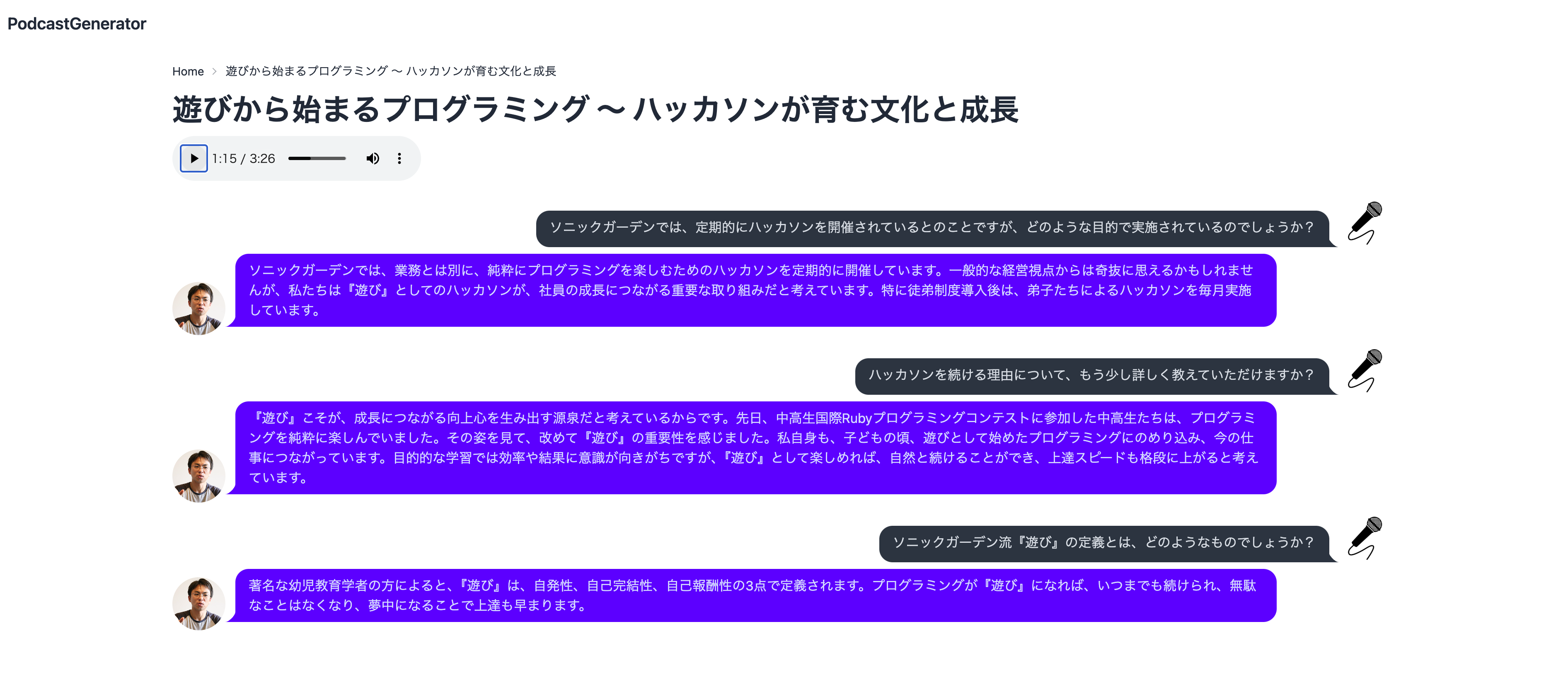 弊社代表、倉貫のブログからPodcastを生成するアプリです。タイトルと文章を貼り付ければ、インタビュー形式の音声に変換されます。