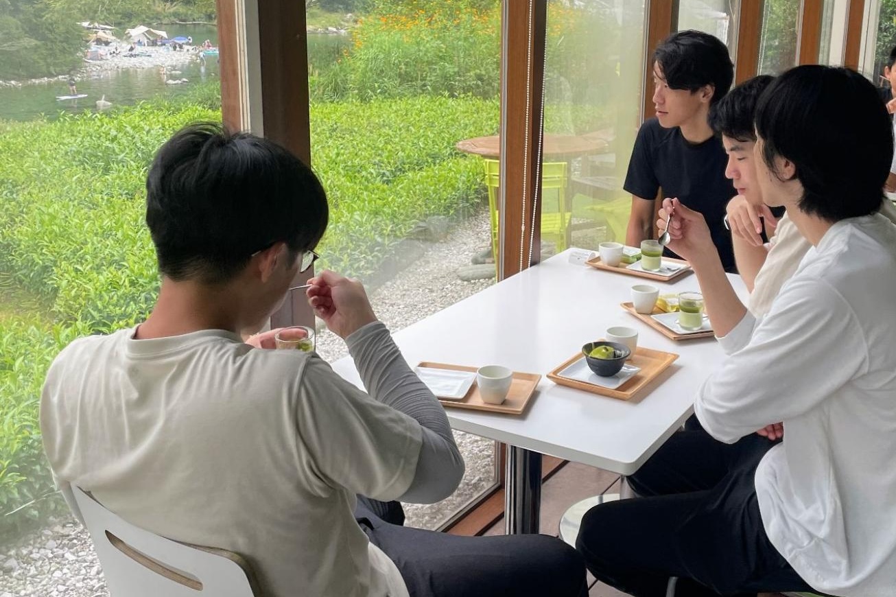仁淀川のSUPを見ながら茶畑プリンを頬張る面々
