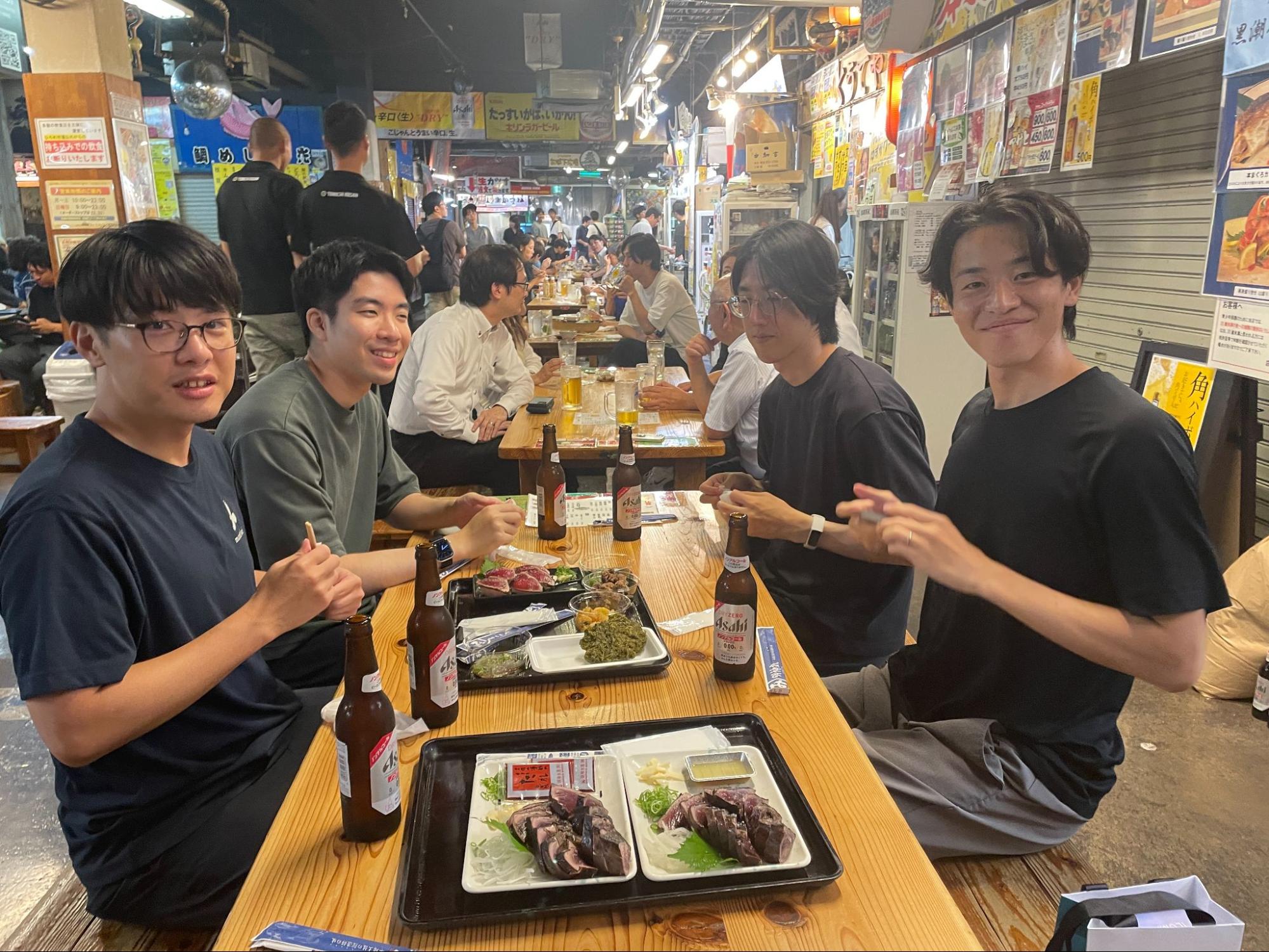 開発がひと段落し、次の日のTODOを話し合った後、高知の観光名所「ひろめ市場」に!
