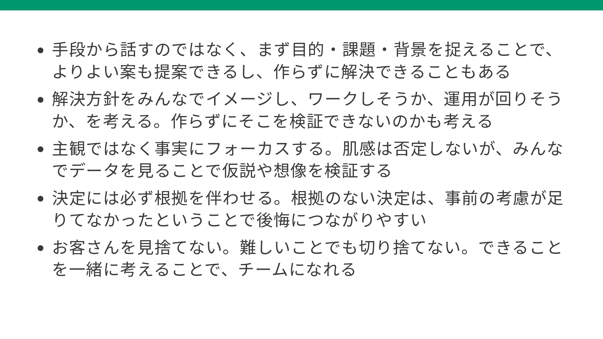 - ・ 解決方針をみんなでイメージし、ワークしそうか、運用が回りそうか、を考える。作らずにそこを検証できないのかも考える
