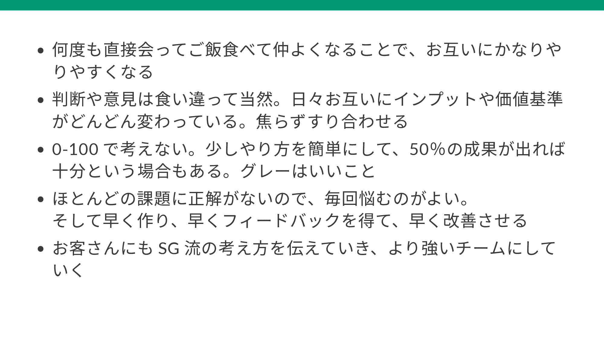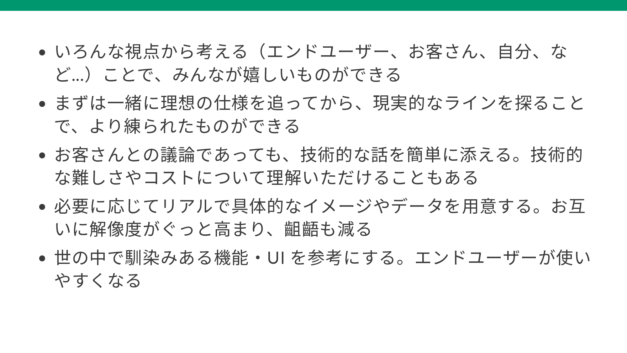 この 5 年間、ソフトウェア開発における自分の技術的な成長ももちろんありましたが、「納品のない受託開発」におけるプログラミング以外の力量にも大きな成長があったと感じています。そこで、今回の成果発表の機会をいいきっかけにして、これまでの自分の経験から、「納品のない受託開発」をうまく進めていくために押さえておくべきポイントを考えてみました。