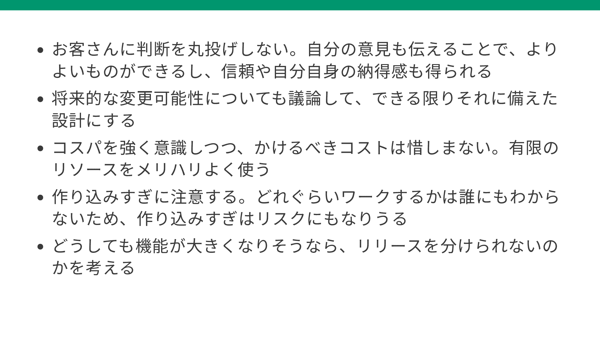 - ・ 作り込みすぎに注意する。どれぐらいワークするかは誰にもわからないため、作り込みすぎはリスクにもなりうる