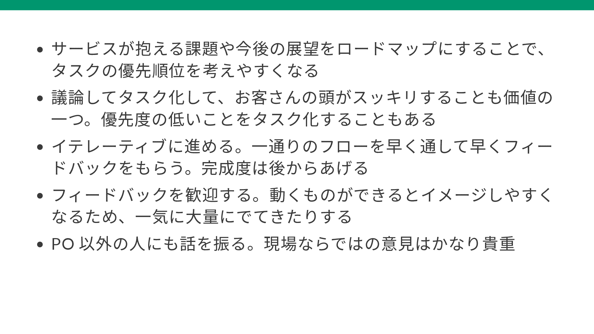 - ・ イテレーティブに進める。一通りのフローを早く通して早くフィードバックをもらう。完成度は後からあげる