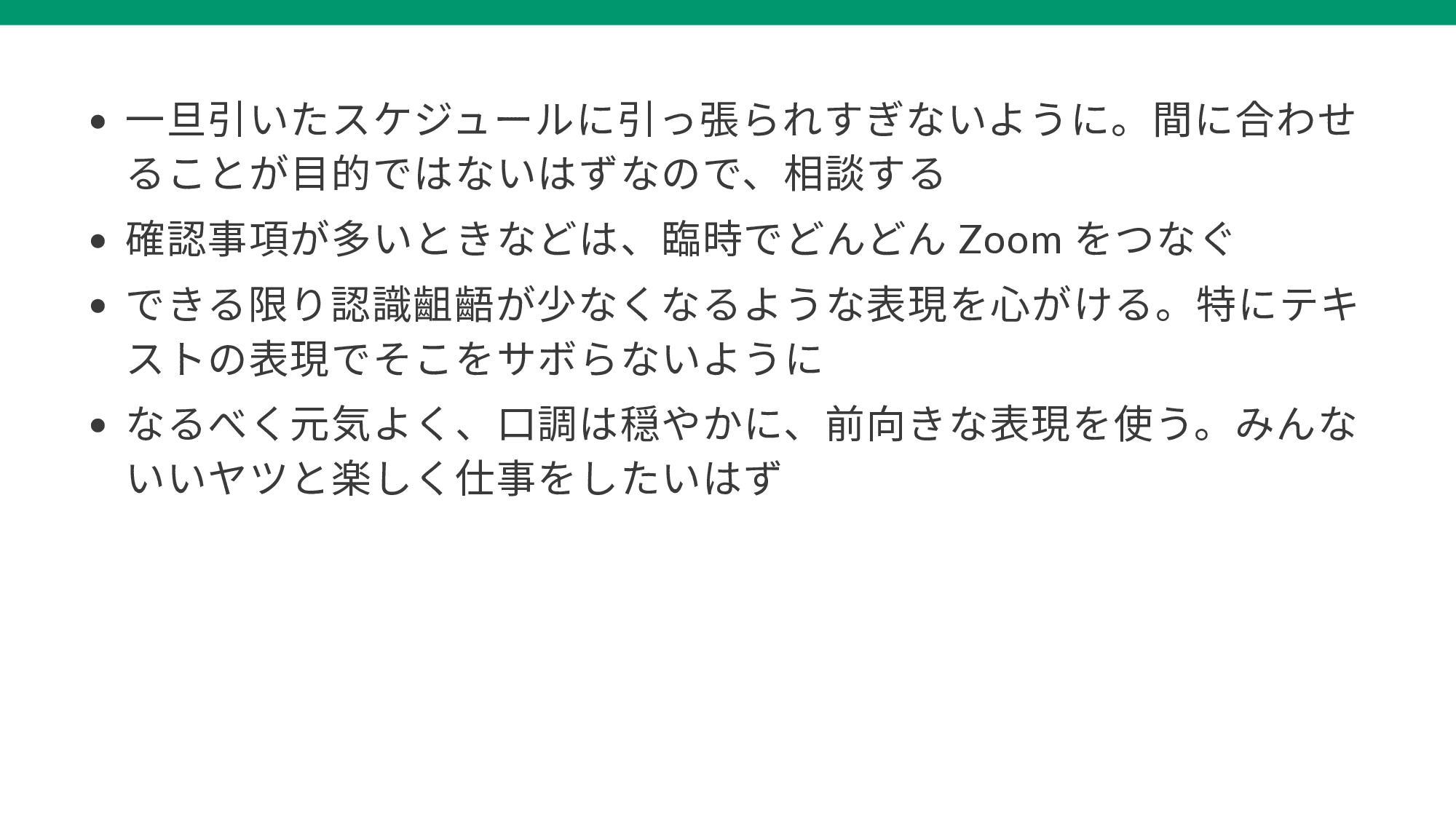 - ・ 0-100 で考えない。少しやり方を簡単にして、50%の成果が出れば十分という場合もある。グレーはいいこと