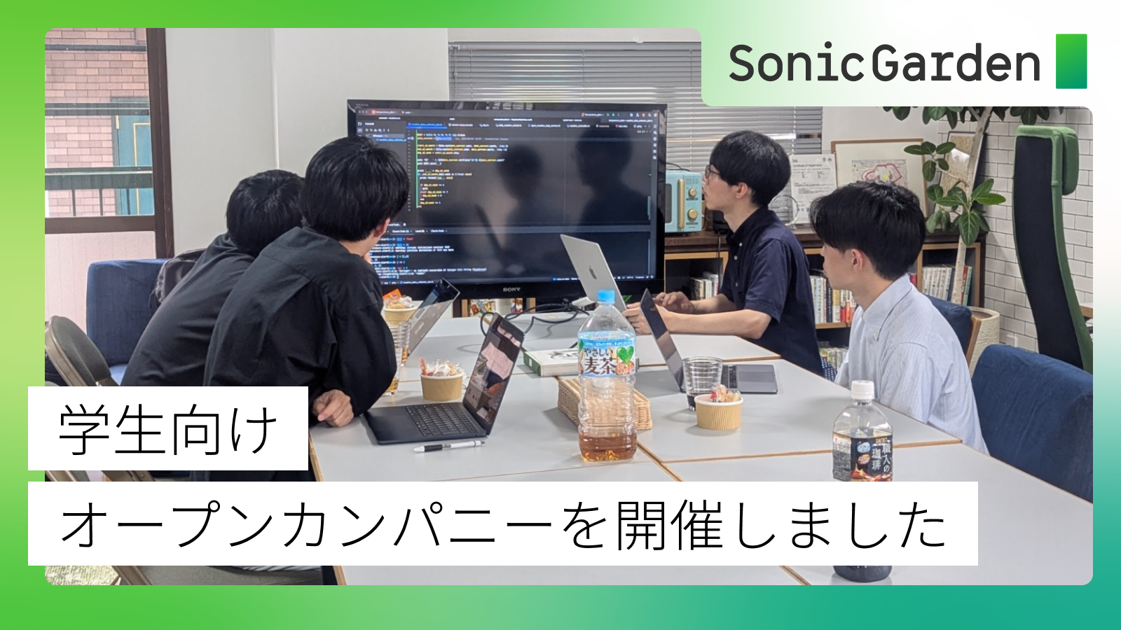 先日9月12日に、ソニックガーデンキャンプを通して仲良くなった学生さんや、採用に関心を持ってくれている学生さんなど計3名を弊社の尾山台オフィスにお招きして、オープンカンパニーを開催しました!この記事では、その際のプログラムや様子をご紹介させていただきます。