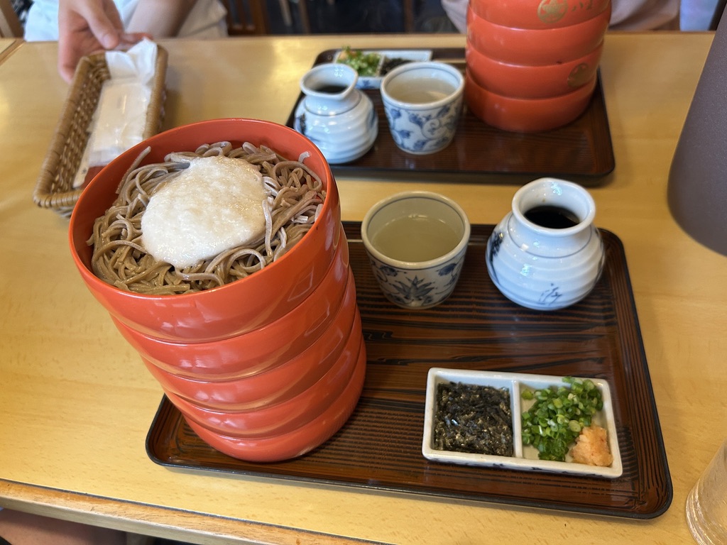 こちらは割子そばというらしく、「割子」が5段重になっており薬味やとそばつゆをかけて1段ずつ食べていくというスタイルでした。美味しかった〜