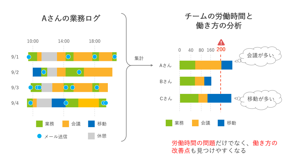業務ログの集積は、未払い残業等の労務リスクを予防するだけではなく、生産性向上施策を考える上での強力な分析ツールにもなります。業務ログが可視化されると、各従業員の働く姿、時間の使い方がよく見えるようになるからです。