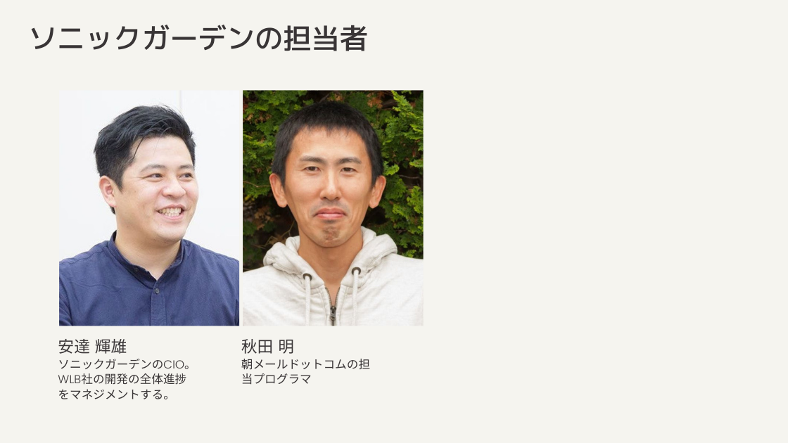 安達WLB社さんは、WLBC養成講座の開発事例に引き続き、2回目のインタビューです。今回は、ソニックガーデンが新たに担当している朝メールドットコム(朝コム)と、カエル会議オンラインの開発についてうかがいます。まずは、朝コムのご紹介をお願いします。